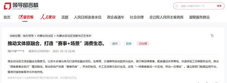 网友在留言中表示,建议打造“赛事+场景”消费生态,在草原、沙漠等特色地貌举办徒步、骑行等品牌赛事,配套建设共享营地、非遗体验工坊等服务空间,推出“跟着赛事去旅行”精品路线。联动农牧户发展“赛事民宿”,开发奶制品、手工艺品等文创衍生品,实现“一场赛事激活一片区域、带动一方增收”。建立跨部门数据监测平台,精准对接游客需求与本地供给。