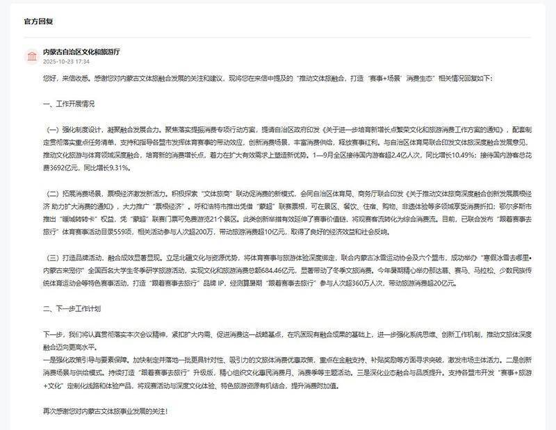 收到留言后,内蒙古自治区文化和旅游厅在回复中介绍了内蒙古文体旅融合发展工作情况。一是强化制度设计,凝聚融合发展合力。聚焦落实提振消费专项行动方案,提请自治区政府印发《关于进一步培育新增长点繁荣文化和旅游消费工作方案的通知》,配套制定贯彻落实重点任务清单,支持和指导各盟市发挥体育赛事的带动效应,创新消费场景,丰富消费供给,释放赛事红利。与自治区体育局联合印发文体旅深度融合发展意见,推动文化旅游与体育领域深度融合,培育新的消费增长点,着力在扩大有效需求上塑造新优势。1-9月全区接待国内游客超2.4亿人次,同比增长10.49%;接待国内游客总花费3692亿元,同比增长9.31%。